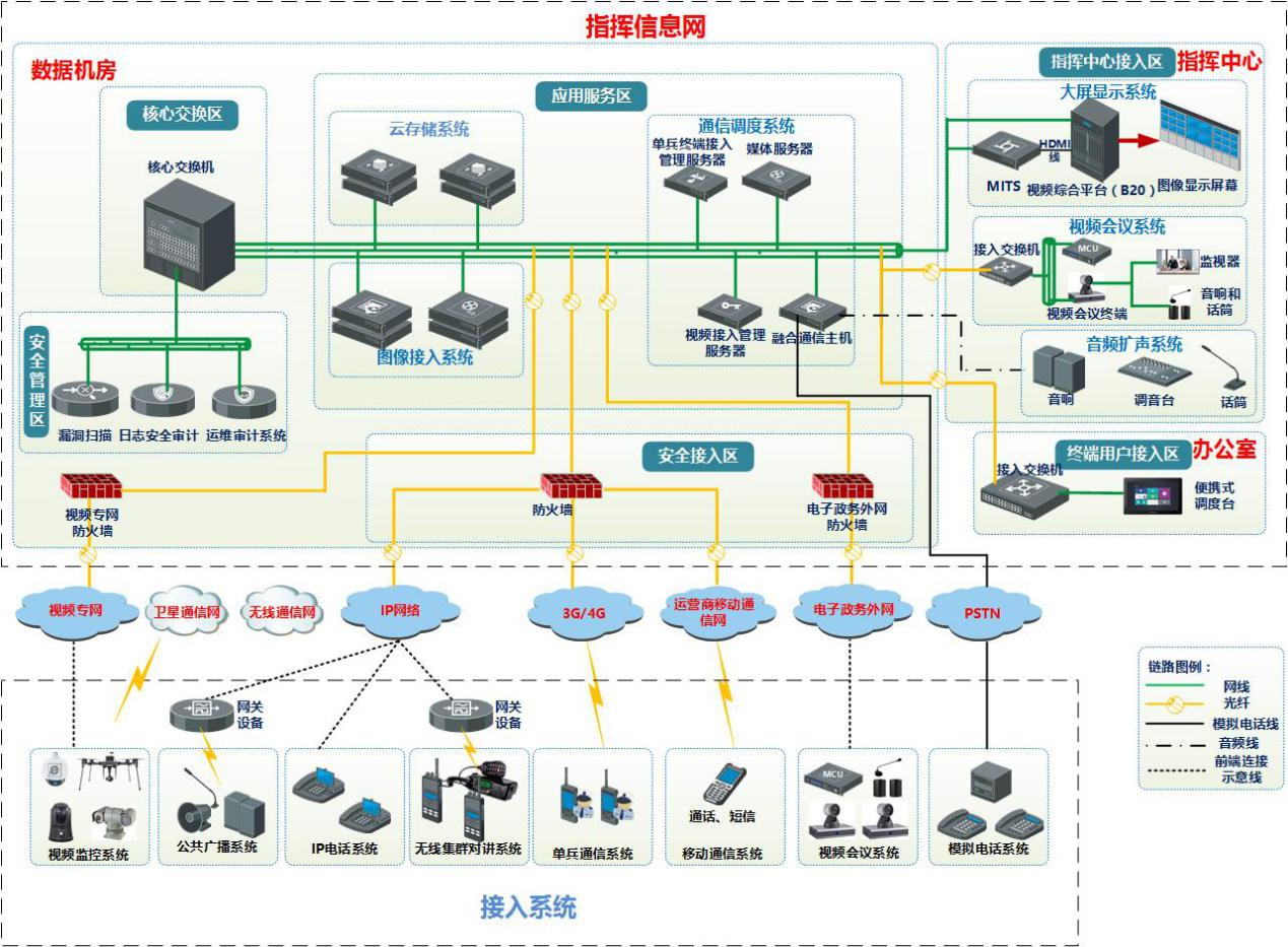 指揮中心的圖像接入系統(tǒng)、通信調(diào)度系統(tǒng)、視頻會(huì)議系統(tǒng)均可以單獨(dú)工作,并且能夠?qū)崿F(xiàn)部、省、市、縣聯(lián)網(wǎng)。其中在省/市等部門指揮中心,圖像接入系統(tǒng)、通信調(diào)度系統(tǒng)、視頻會(huì)議系統(tǒng)之間以及與大屏顯示系統(tǒng)及音頻擴(kuò)聲系統(tǒng)之間根據(jù)業(yè)務(wù)需要進(jìn)行系統(tǒng)對(duì)接。在無(wú)線通信網(wǎng)、電子政務(wù)外網(wǎng)、衛(wèi)星通信網(wǎng)上的各類視頻、音頻、數(shù)據(jù)采集類設(shè)備或者行業(yè)平臺(tái),通過(guò)安全設(shè)備接入指揮信息網(wǎng),實(shí)現(xiàn)與圖像接入系統(tǒng)、通信調(diào)度系統(tǒng)等對(duì)接。業(yè)務(wù)架構(gòu)示意圖如下: